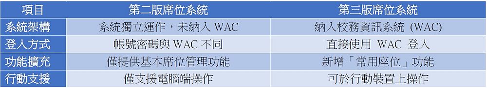 第二版系統因採獨立開發,並無與校務系統整合,且無行動化支援,面臨須進行汰換與升級,維護困難等問題。為提升校務資訊整合效益, 113年開發第三版席位系統,在113年03月01日正式上線,重新設計架構與操作流程,讓席位使用管理更加流暢與安全。